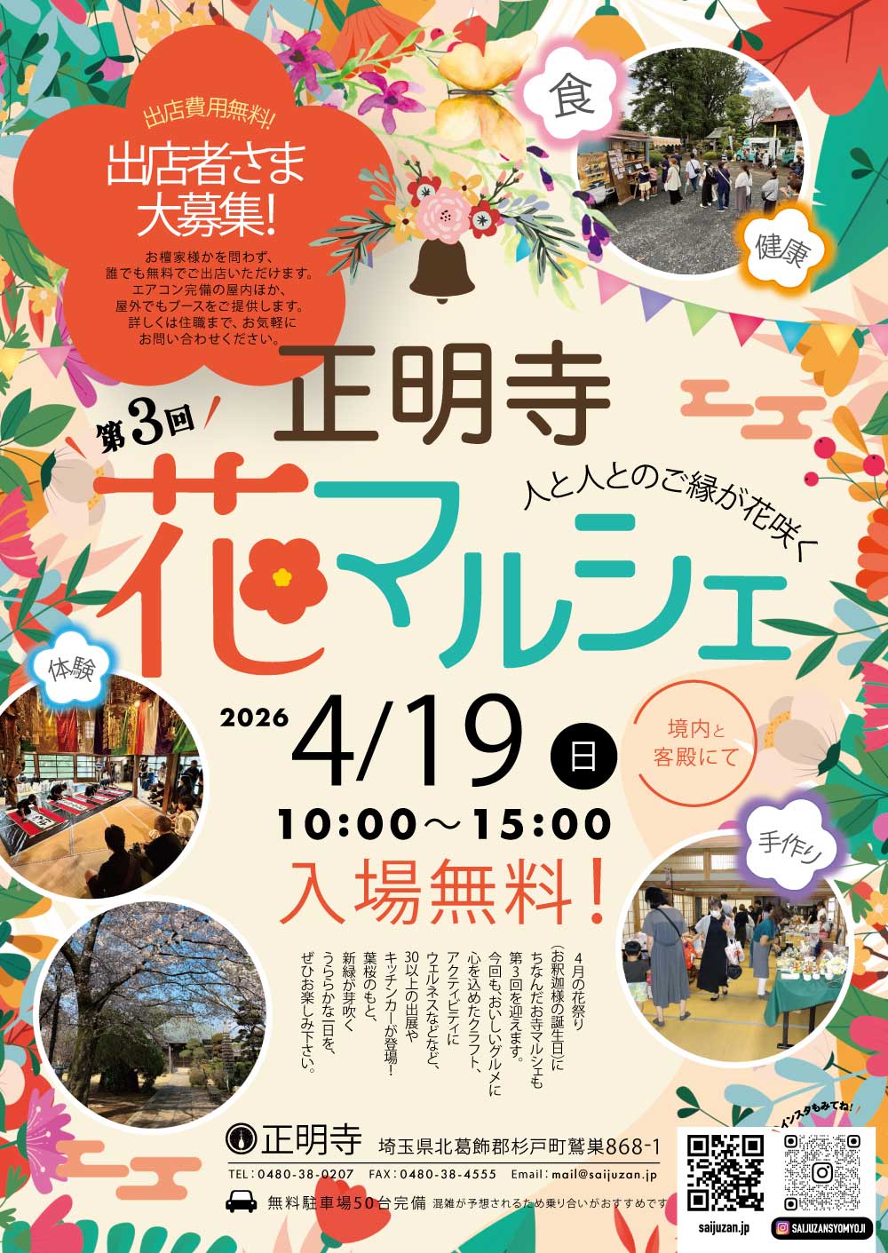 令和8年4月19日(日)、正明寺境内および客殿にて「第3回 正明寺 花マルシェ」を開催いたします。