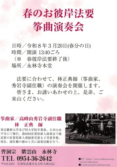 2026.02.16 NEW 佐賀県 ?> 開催日時:2026年 3月 20日(金) 13時~15時会場:永林寺(佐賀県佐賀県武雄市北方町大字大崎4432)定員:特になし費用:無料 春彼岸法要に併せ、曹洞宗の僧侶であり、箏曲家の林正典師の箏曲演奏会を開催します。 春彼岸法要の後、午後1時40分ごろからの演奏開始の予定です。 梅花流詠讃歌も演奏いただく予定です。皆様、どうぞご来山ください。