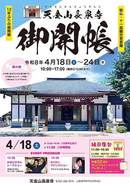 4/18~24 長泉寺秘仏十一面観世音菩薩御開帳大祈祷会(山梨県長泉寺) 2026.04.13 NEW 山梨県 ?> 開催日時:2026年 4月 18日(土) 10時‐17時~ 4月 24日(金) 10時‐15時会場:天金山長泉寺(山梨県甲府市白井町662)定員:20名費用:5000円 18日初日のみ10時 ご祈祷受付11時 丙午御開帳大祈祷会13時30分 みほとけさんトークショー14時30分 わくわくマジックショー 11時‐16時 縁日屋台