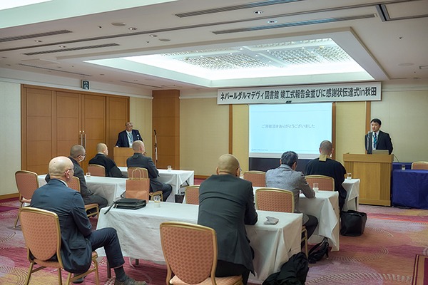帰国後、秋田市内のホテルを会場に、ネパールへの訪問が叶わなかった信正寺(秋田県大館市)、源光庵(京都府京都市)へ、現地で預かった感謝状を贈呈する会を開催した。ネパールの現状や教育環境、竣工式の様子をSVAスタッフより報告してもらった。秋田県の僧侶の方々にもご参加いただき、ネパールへ関心を向けてもらう機会となった。